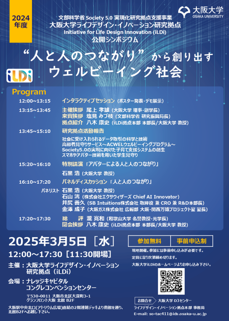 | プログラム | 12:00-13:15 インタラクティブセッション(ポスター発表・デモ展示) ※ 一部、デモ体験ができます 13:15-13:45 主催挨拶 尾上孝雄(大阪大学理事・副学長) 来賓挨拶 塩見みづ枝(文部科学省 研究振興局長) 拠点紹介 八木康史(iLDi拠点本部 本部長/大阪大学産業科学研究所 教授) 13:45-15:10 研究拠点活動報告 社会に受け入れられるデータ取引の科学と技術 高齢者見守りサービス~ACWELウェルビーイングプログラム~ Society5.0の実現に向けた子育て支援システムの創生 スマホやアバター技術を用いた学生見守り 15:20-16:10 特別講演「アバターによる人と人のつながり」 石黒 浩(大阪大学基礎工学研究科 教授) 16:10-17:20 パネルディスカッション 「人と人のつながり」 パネリスト 石黒 浩(大阪大学 教授) 石山 洸(株式会社エクサウィザーズ Chief AI Innovator) 井尻 善久(SB Intuitions株式会社 取締役 兼 CRO 兼 R&D本部長) 金澤 成子(大阪ガス株式会社 広報部 大阪・関西万博プロジェクト室長) 17:20-17:30 総評 瀧寛和(和歌山大学 名誉教授・元学長) 閉会挨拶 八木康史(iLDi拠点本部 本部長) |